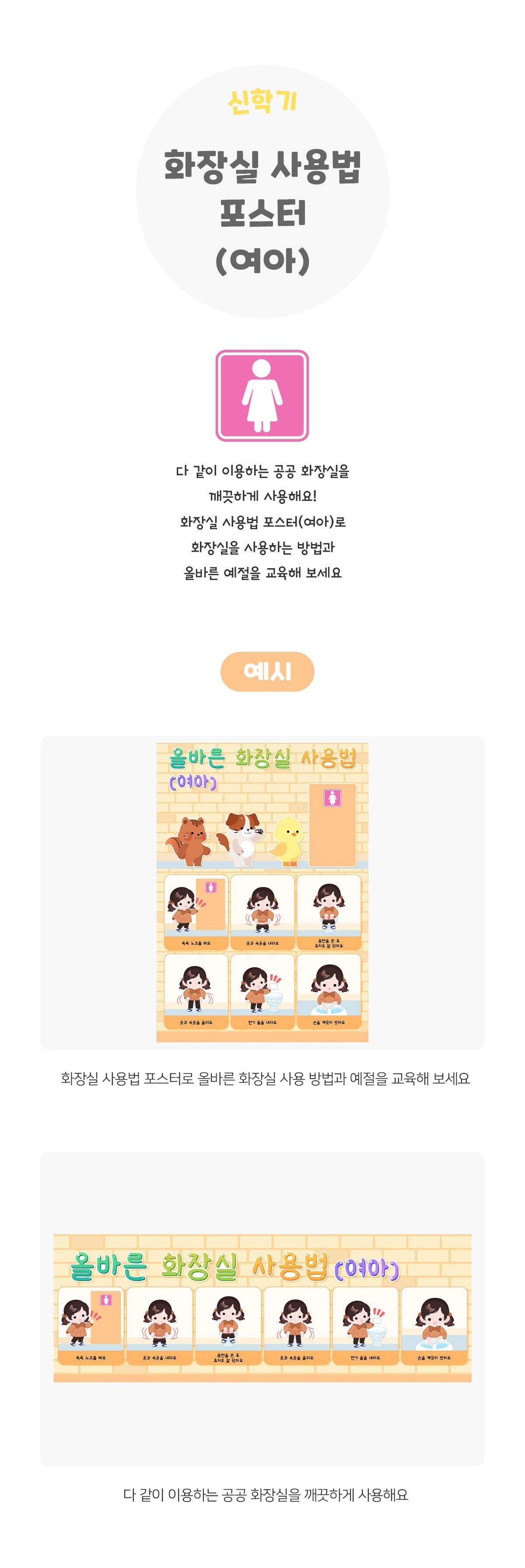태그 : 화장실사용법포스터, 여아화장실사용법포스터, 화장실사용법순서도, 위생교육, 새학기, 신학기, 어린이집, 유치원, 새학기준비, 신학기준비, 환경구성, 환경판, 게시판, 표지판, 안내판, 포스터, 기본생활습관, 화장실에티켓, 화장실사용방법.