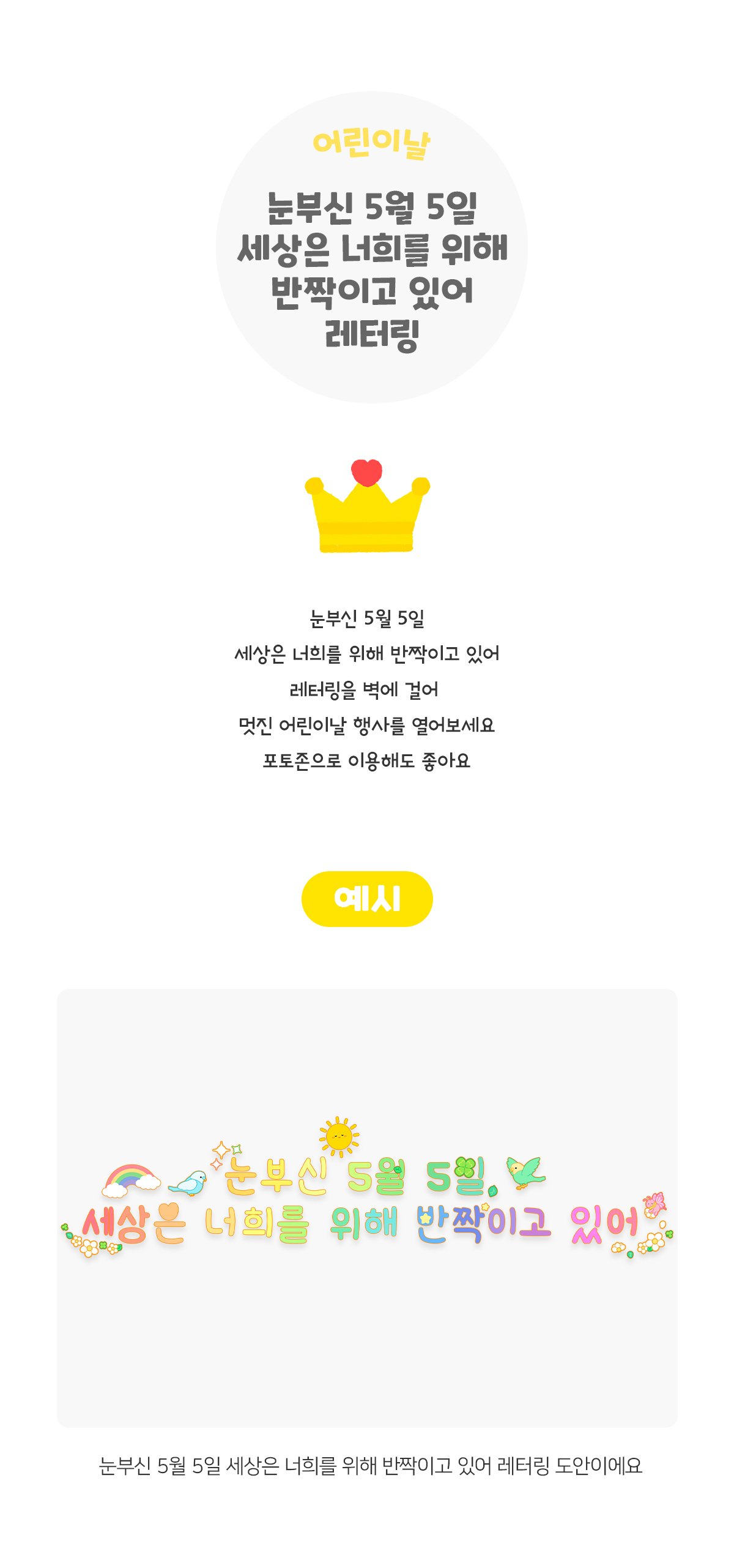 태그 : 눈비신5월5일세상은너희를위해반짝이고있어레터링, 어린이날, 어린이날행사, 어린이날도안, 어린이날활동, 최고의어린이, 5월5일, 가정의달, 어린이날레터링, 최고의어린이어워드.