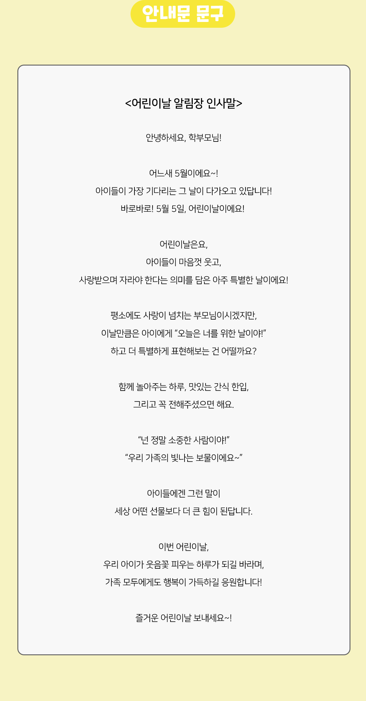 태그 : 어린이날알림장인사말, 알림장, 어린이날, 어린이날알림장, 어린이날행사, 인사말, 알림장인사말, 가정통신문, 가통, 5월5일, 행사, 행사인사말, 행사안내, 안내.