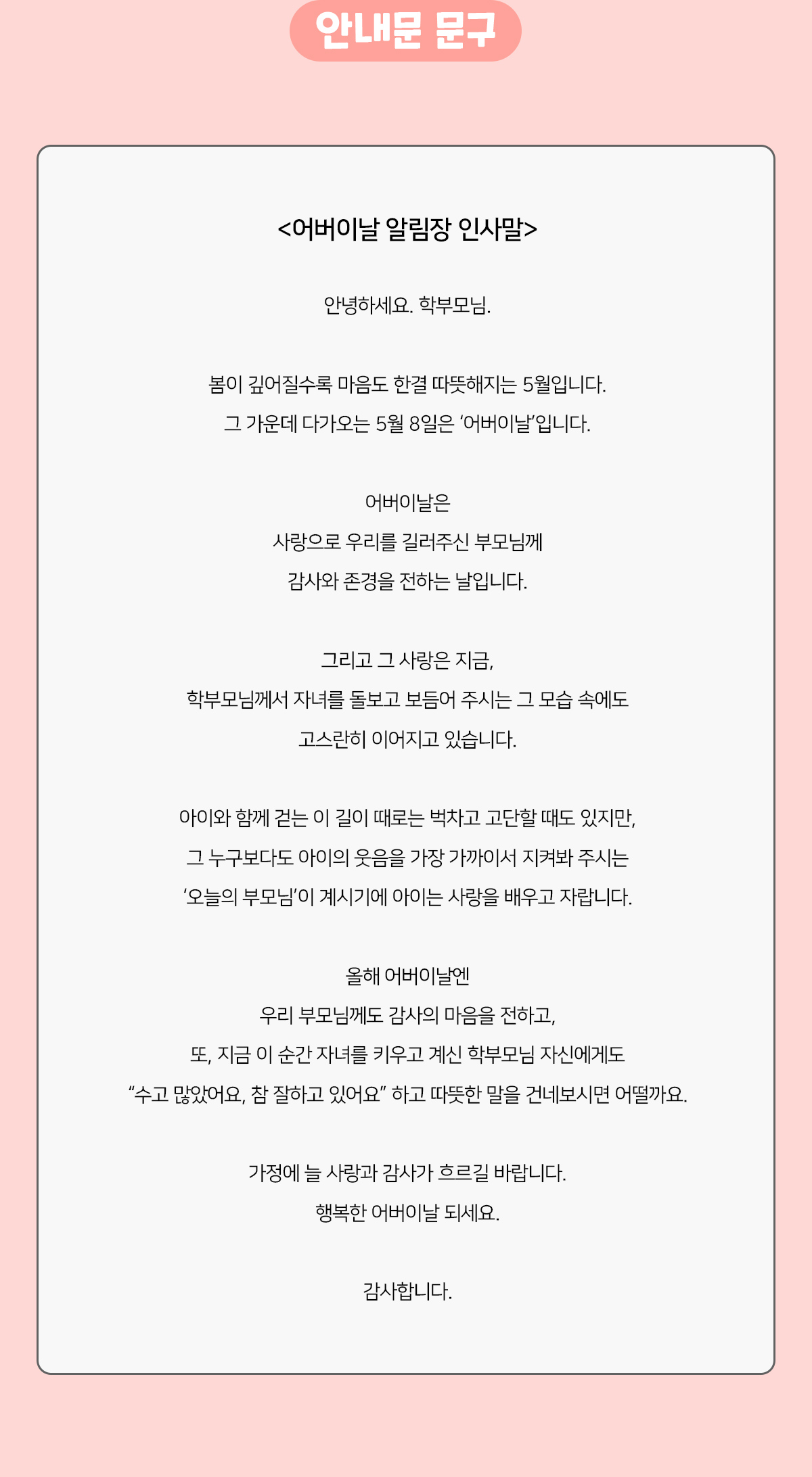 태그 : 어버이날알림장인사말, 알림장, 어버이날, 어버이날알림장, 어버이날행사, 인사말, 알림장인사말, 가정통신문, 가통, 5월8일, 행사, 행사인사말, 행사안내, 안내.