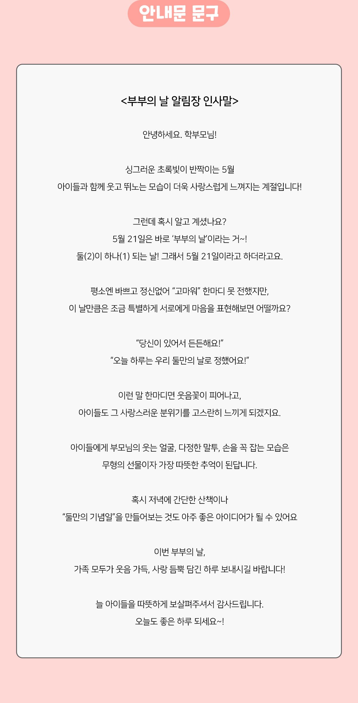 태그 : 부부의날알림장인사말, 알림장, 부부의날, 부부의날알림장, 부부의날행사, 웨딩데이, 인사말, 알림장인사말, 가정통신문, 가통, 5월21일, 행사, 행사인사말, 행사안내, 안내.