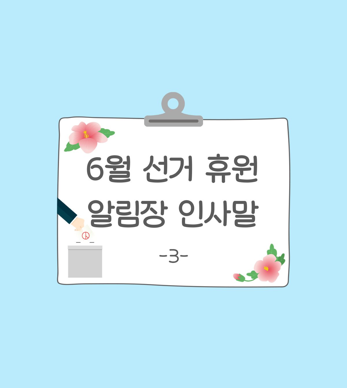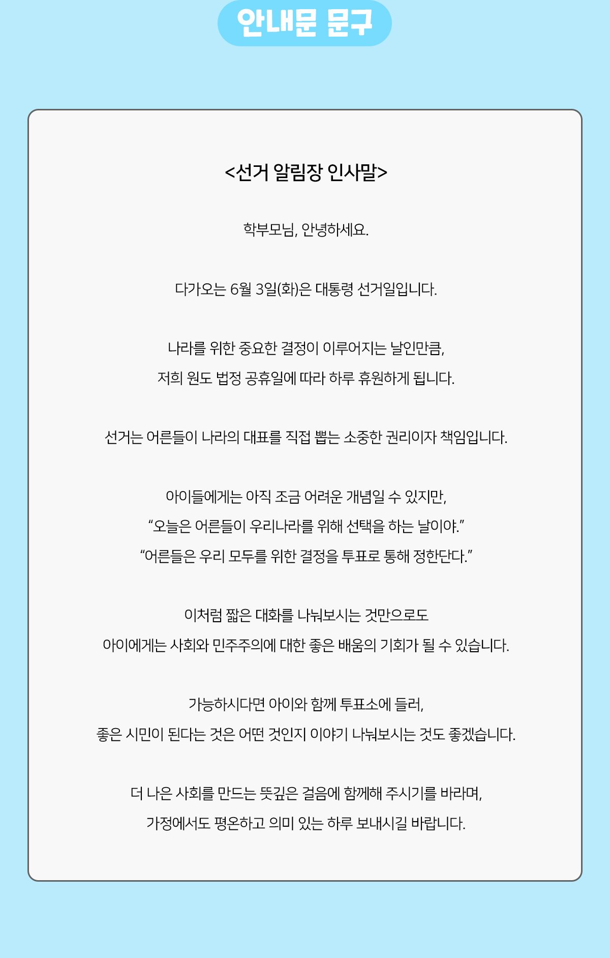 태그 : 선거알림장인사말, 알림장, 선거, 선거알림장, 인사말, 알림장인사말, 가정통신문, 가통, 안내, 선거놀이, 휴원안내, 휴원알림장, 휴원안내알림장, 휴원, 6월행사알림장, 6월행사, 선거휴원알림장인사말.