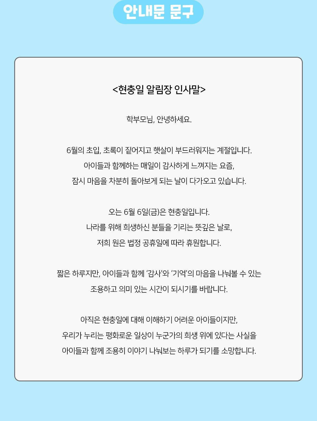 태그 : 현충일알림장인사말, 알림장, 현충일, 현충일알림장, 인사말, 알림장인사말, 가정통신문, 가통, 안내, 군대놀이, 휴원안내, 휴원알림장, 휴원안내알림장, 휴원, 6월행사알림장, 6월행사, 현충일휴원알림장.
