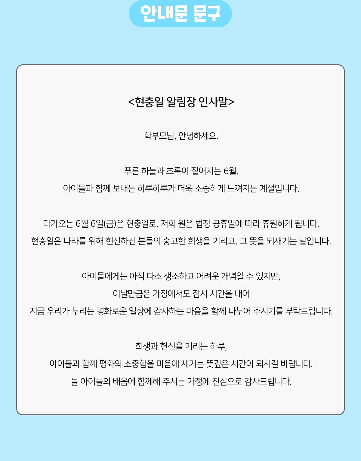 태그 : 현충일알림장인사말, 알림장, 현충일, 현충일알림장, 인사말, 알림장인사말, 가정통신문, 가통, 안내, 군대놀이, 휴원안내, 휴원알림장, 휴원안내알림장, 휴원, 6월행사알림장, 6월행사, 현충일휴원알림장.