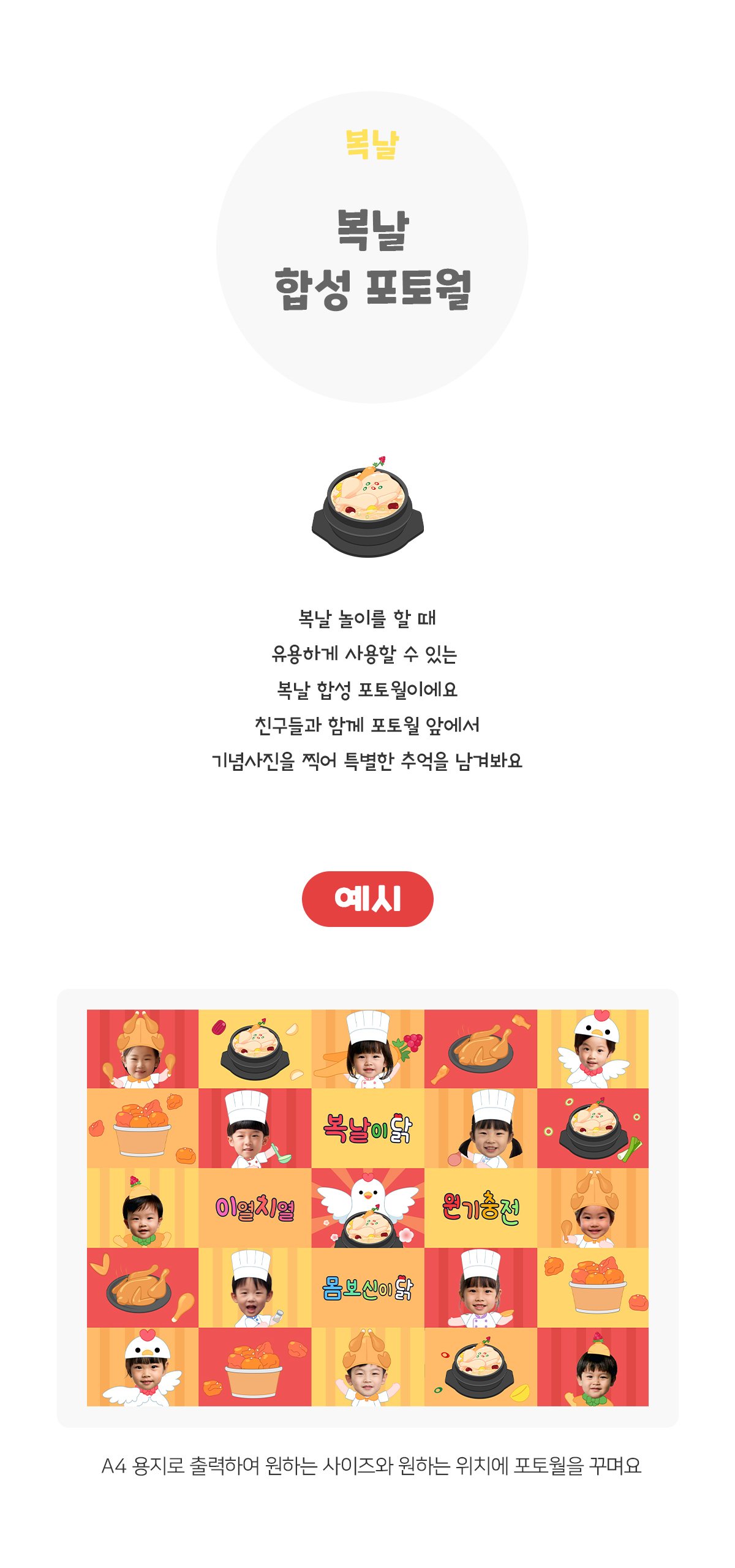 태그 : 복날합성포토월, 복날, 여름, 복날놀이, 삼계탕, 치킨, 닭, 초복, 중복, 말복, 삼계탕놀이, 삼계탕가게, 삼계탕가게놀이, 인삼, 옛날통닭, 옛날치킨, 닭고기, 치킨가게, 치킨가게놀이, 후라이드치킨, 양념치킨, 몸보신, 여름놀이, 전통음식, 전통문화, 복날행사, 포토월, 포토존, 복날포토존, 환경구성, 복날환경구성, 합성포토월.