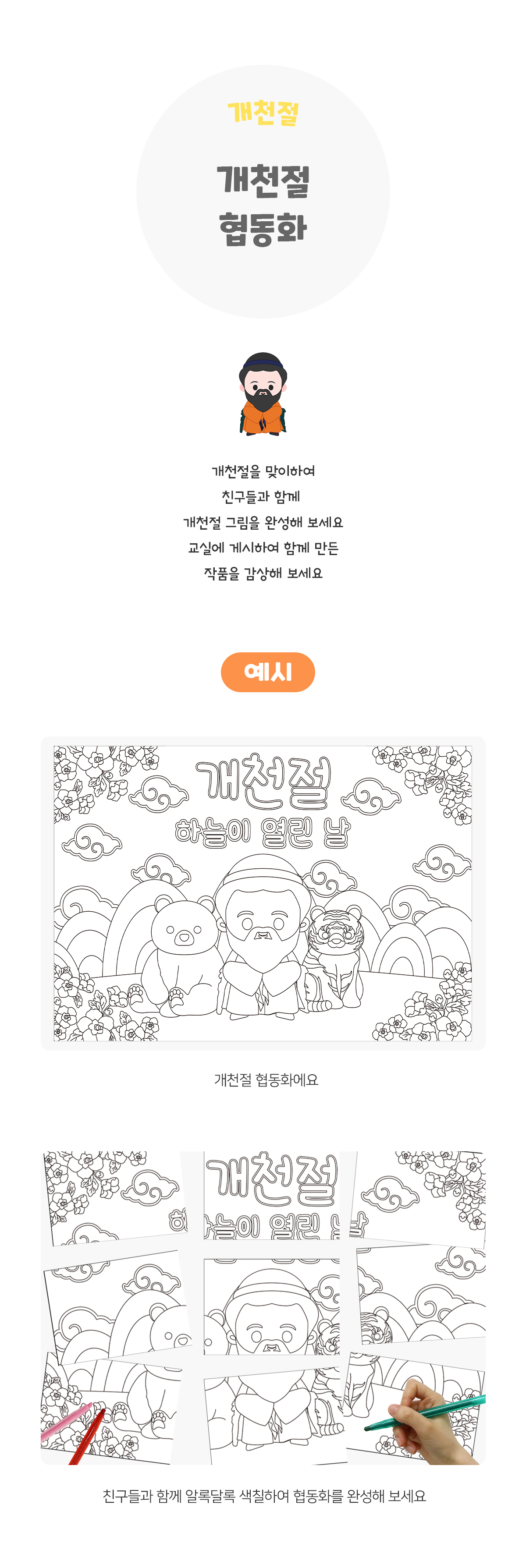 태그 : 개천절협동화, 우리나라, 개천절, 고조선, 단군왕검, 단군신화, 곰, 호랑이, 마늘, 쑥, 우사, 풍백, 운사, 국경일, 우리나라활동, 우리나라놀이, 우리나라도안, 개천절활동, 개천절놀이, 개천절도안, 10월3일, 협동화, 우리나라협동화, 콜라주, 모자이크, 협동화작품, 미술활동, 개천절색칠.