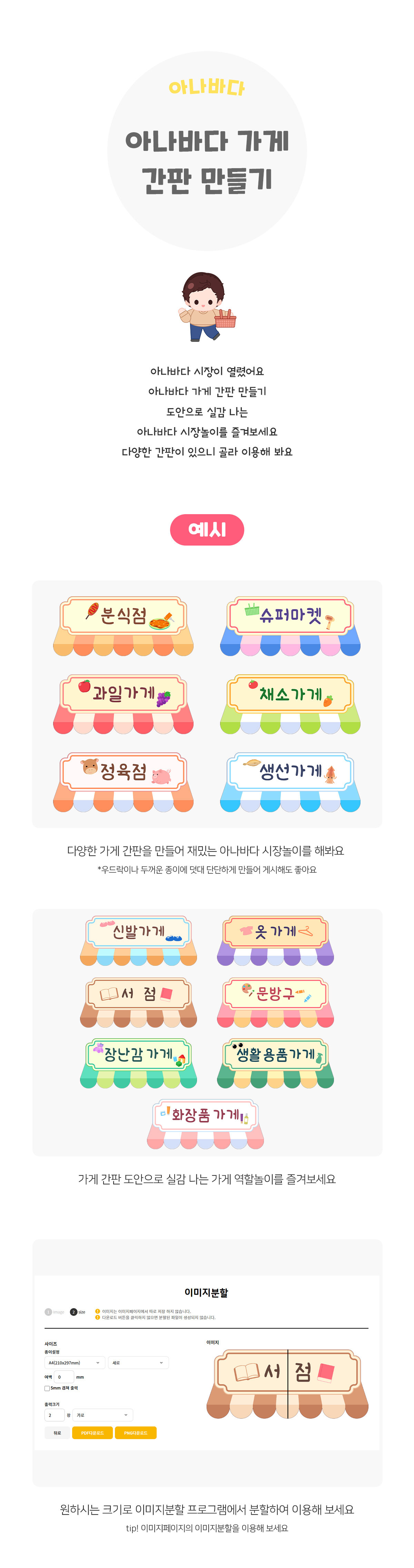 태그 : 아나바다가게간판만들기, 아나바다, 환경과생활, 환경, 환경활동, 아나바다놀이, 아나바다활동, 아껴쓰기, 나눠쓰기, 바꿔쓰기, 다시쓰기, 환경캠페인, 시장놀이, 가게놀이, 플리마켓, 플리마켓놀이, 나눔장터, 벼룩시장, 플리마켓간판, 나눔장터간판, 채소가게, 과일가게, 슈퍼마켓, 생선가게, 정육점, 분식점, 서점, 문방구, 장난감가게, 생활용품가게, 옷가게, 화장품가게, 신발가게.