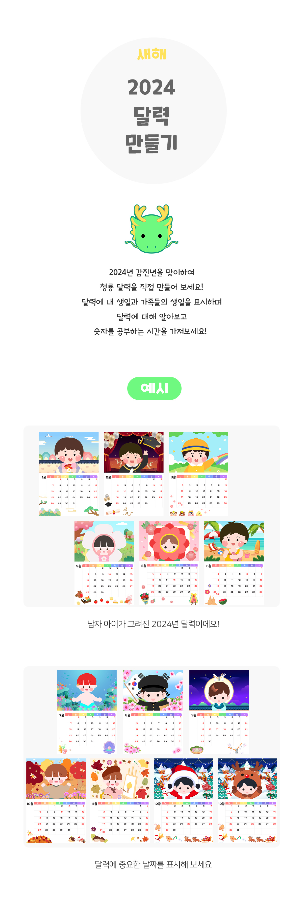 태그 : 2024년달력만들기, 2024년달력, 2024, 청룡해, 청룡띠, 새해, 신년, 명절, 새해놀이, 새해만들기, 갑진년, 달력만들기, 남아달력, 여아달력, 청룡.