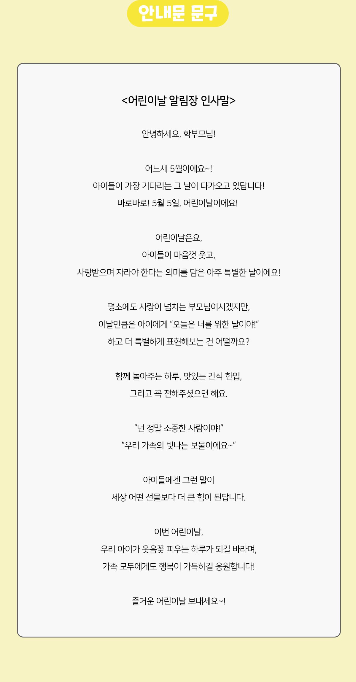 태그 : 어린이날알림장인사말, 알림장, 어린이날, 어린이날알림장, 어린이날행사, 인사말, 알림장인사말, 가정통신문, 가통, 5월5일, 행사, 행사인사말, 행사안내, 안내.