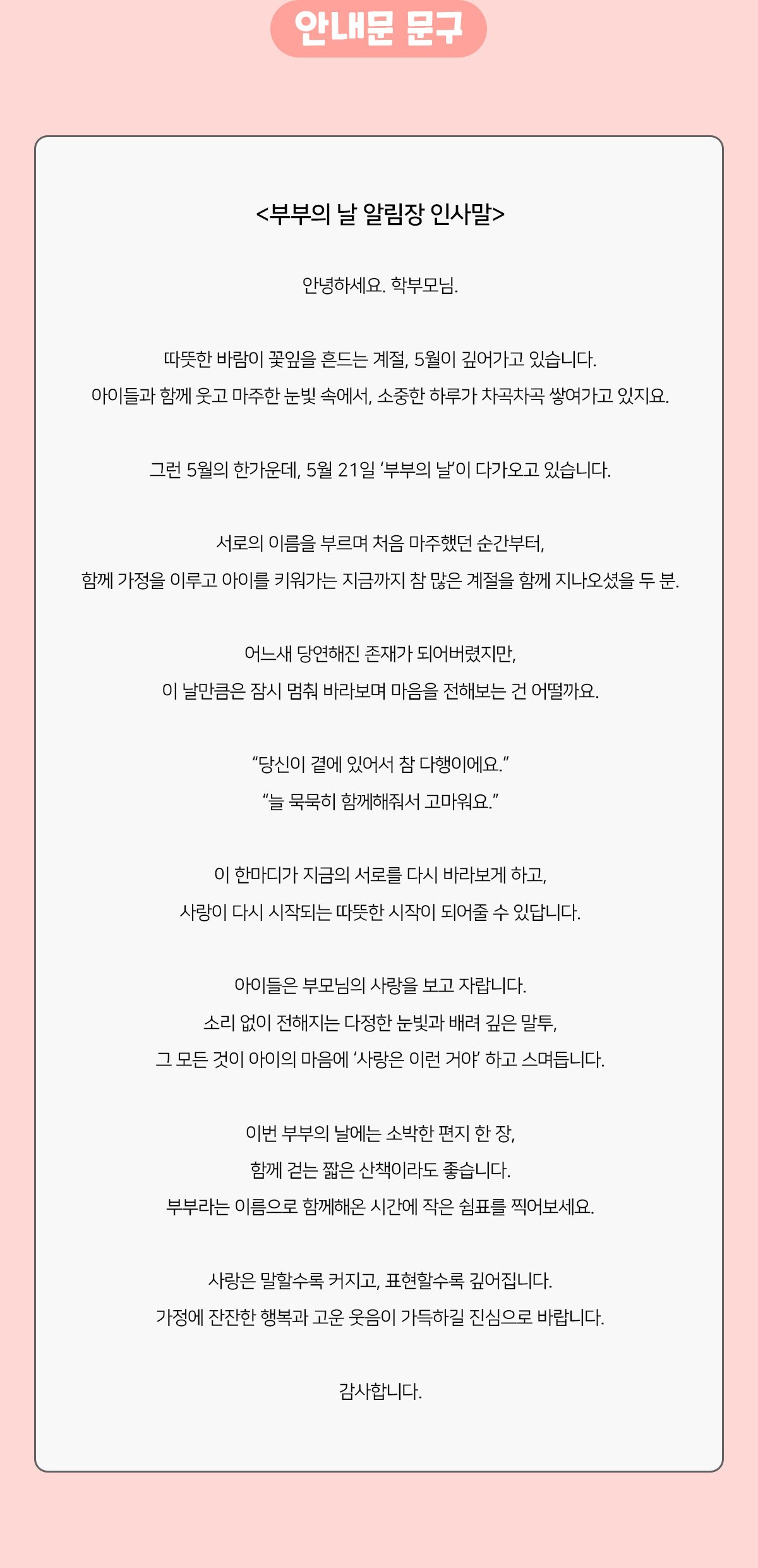 태그 : 부부의날알림장인사말, 알림장, 부부의날, 부부의날알림장, 부부의날행사, 웨딩데이, 인사말, 알림장인사말, 가정통신문, 가통, 5월21일, 행사, 행사인사말, 행사안내, 안내.