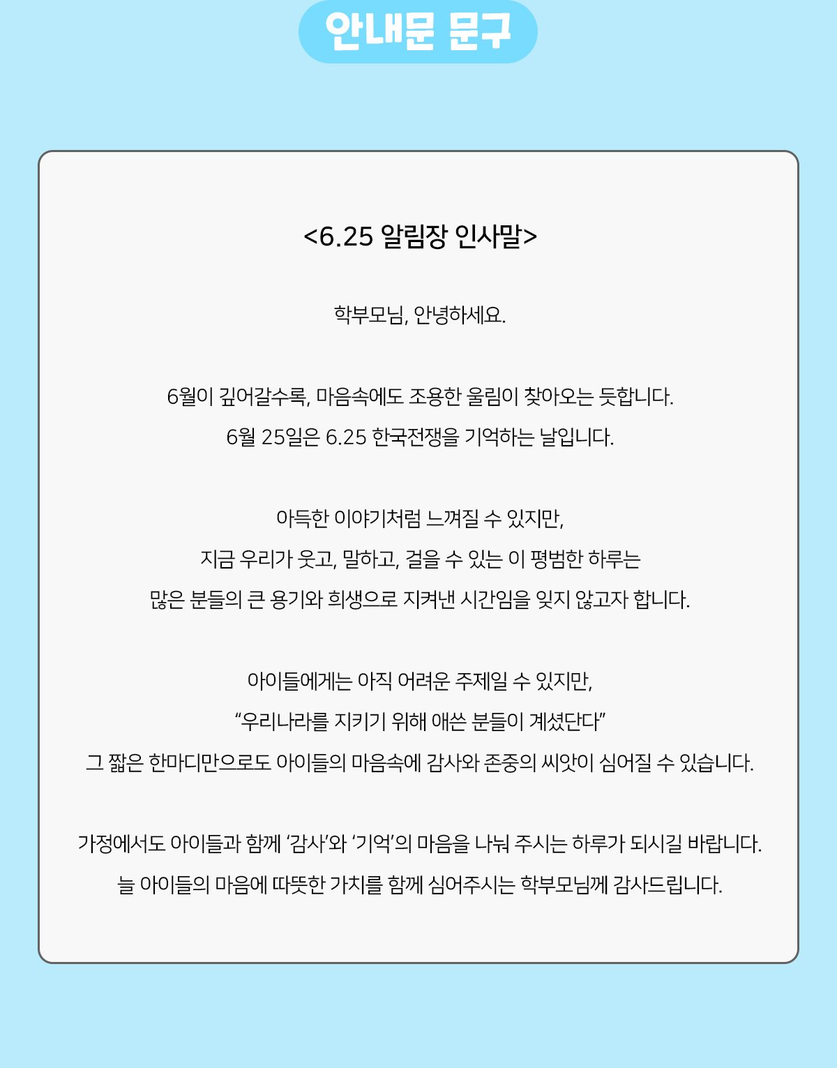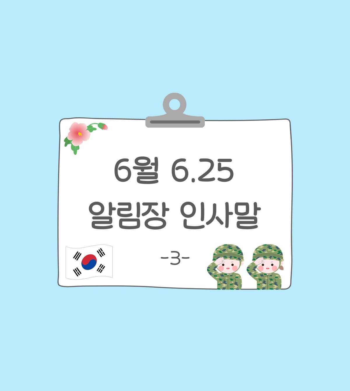 태그 : 6.25알림장인사말, 알림장, 6.25, 6.25알림장, 인사말, 알림장인사말, 가정통신문, 가통, 군대놀이, 안내, 625, 6월25일, 6월행사알림장, 6월행사.