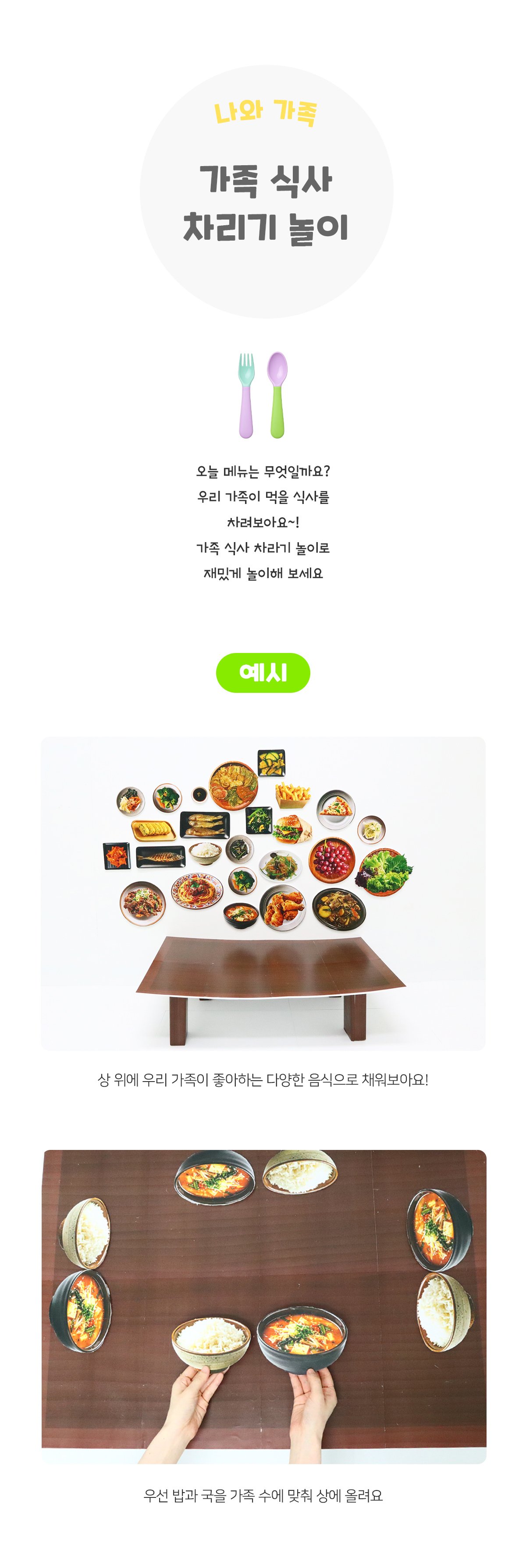 태그 : 가족식사차리기놀이, 가족, 나와가족, 우리가족, 가족구성원, 식사, 음식, 가족식사, 식기류, 숟가락, 젓가락, 포크, 수저세트, 상차리기, 아침, 점심, 저녁, 저녁차리기놀이, 주방, 부엌, 주방놀이.