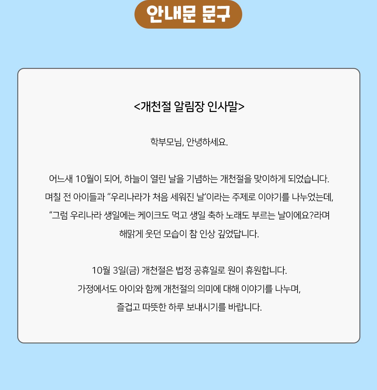 태그 : 개천절알림장인사말, 우리나라, 개천절, 고조선, 단군왕검, 단군신화, 곰, 호랑이, 마늘, 쑥, 우사, 풍백, 운사, 국경일, 10월3일, 개천절알림장, 알림장, 인사말, 알림장인사말, 가정통신문, 가통, 안내, 10월안내, 휴원안내, 국경일안내.