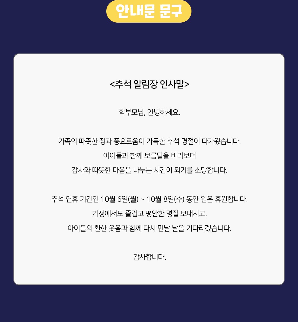 태그 : 추석알림장인사말, 우리나라, 추석, 한가위, 명절, 추석명절, 추석알림장, 명절알림장, 추석연휴알림장, 알림장, 인사말, 알림장인사말, 가정통신문, 가통, 안내, 10월안내, 휴원안내.